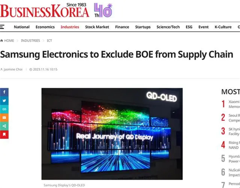此外,据悉三星电子打算在中长期内与京东方断绝关系。三星的决定已经对京东方产生了负面影响,京东方在第三季度的市场份额出现了下降。市场观察人士认为,三星电子决定与京东方切断联系,并将该该公司从其面板供应链中剔除,与三星显示器和京东方之间正在进行的法律纠纷有关。