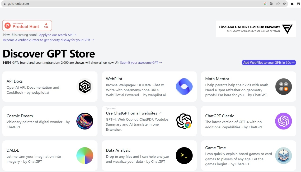 “在新用户排队等号的时候,老用户已经开发了一波又一波的GPTs。官方的GPT Store还未上线,第三方开发的网站GPT Hunter已经收录了1.5万个GPTs,而且还在持续增长。而据第三方网站allgpt.co的统计,GPTs的上传速度高达三分钟一个。