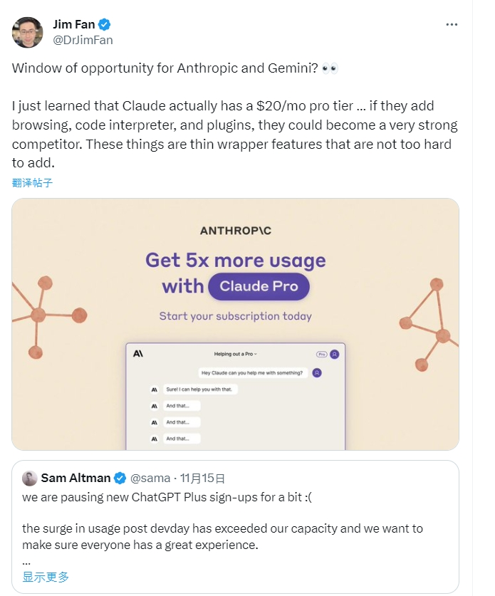 在OpenAI暂停订阅之际,有人表示竞争对手的机会来了。英伟达的高级AI科学家Jim Fan发推表示: