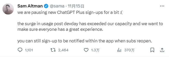 OpenAI在首次开发者大会上推出定制GPT功能刚过去一周,蜂拥而入的开发者就挤爆了服务器。11月15日,阿尔特曼不得不宣布,暂停ChatGPT Plus新用户注册。该功能是ChatGPT的付费版,月费20美元,只有开通了才能开发定制GPTs和使用其他人开发的GPTs。