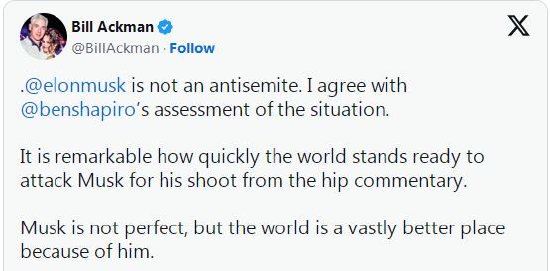 在周末的一条帖子中,阿克曼表示,马斯克不是反犹主义者,并同意保守派政治专家本·夏皮罗(Ben Shapiro)对这一事件的评估。