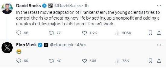 萨克斯在X平台上发帖称:“在最新改编自《弗兰肯斯坦》的电影中,这位年轻的科学家试图控制创造新生命的风险,为此他成立了一个非营利组织,并在董事会中增加了几名伦理学专业的学生。结果行不通。”