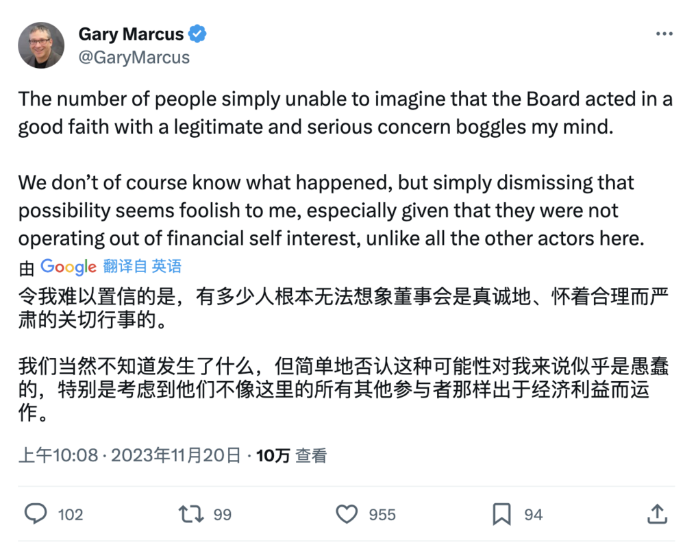 曾与Altman一同参加过美国国会质询的Gary Marcus则表示:根本无法想象董事会是真诚地、怀着合理而严肃的关切行事的。