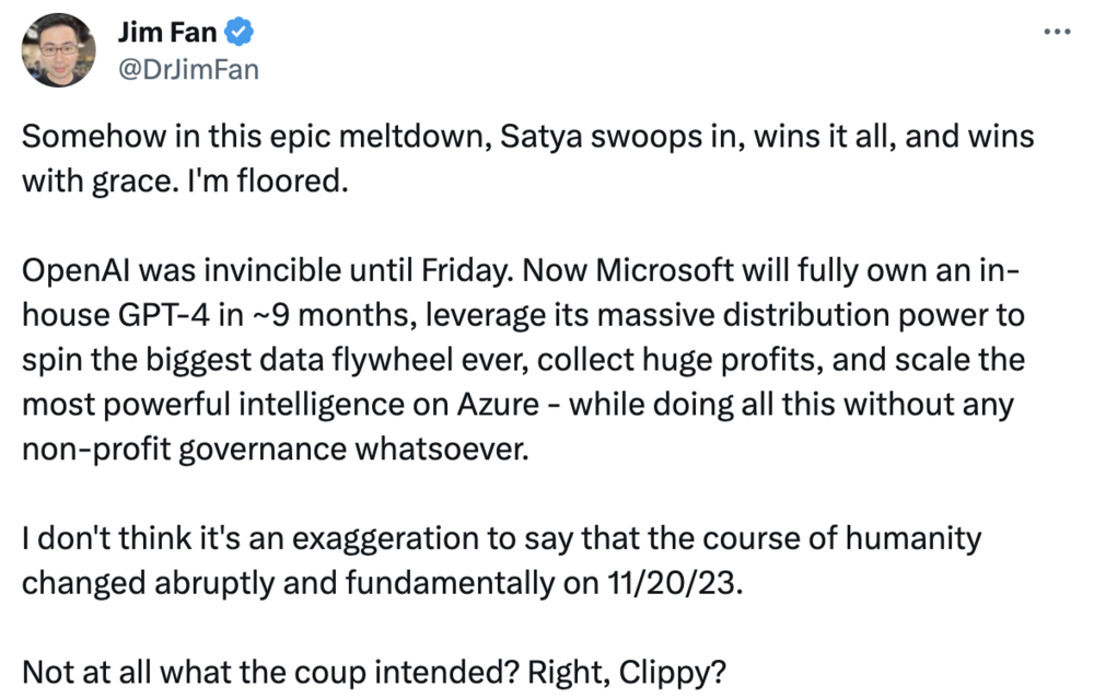 NVIDIA高级AI科学家Jim Fan则发推:OpenAI 直到周五都处于无敌状态。现在,微软将在大约 9 个月内完全拥有内部 GPT-4。