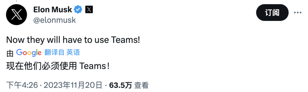 在Nadella的官宣推文下,Musk调侃道:Now they will have to use Teams!(现在他们必须用Teams了。