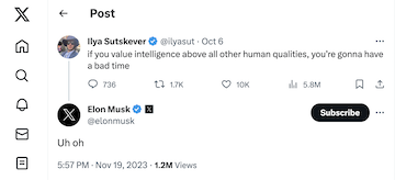张琦认为,苏茨克维曾在10月发布了一篇推文,称“如果将智能置于其他所有人类品质之上,则会有一段不愉快的经历”。在张琦看来,这可能暗示了董事会在那时已有所准备,“冰冻三尺非一日之寒”。