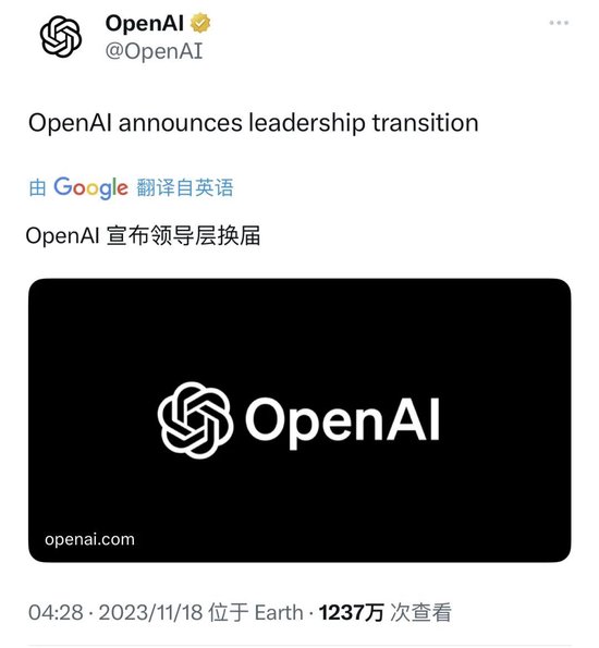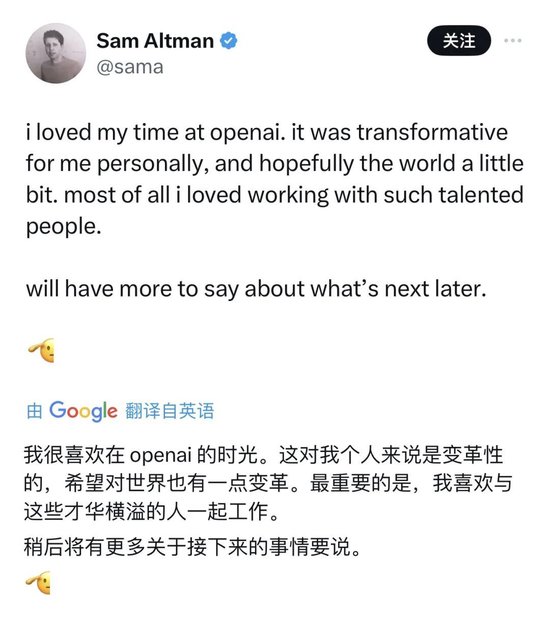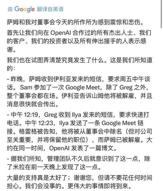 公告发布后迅速引起全球级别的热议。消息官宣后不久,奥特曼在X发文称“我很喜欢在OpenAI的时光”,并表示“未完待续”。格雷格也在几小时后发布了长推文,披露了更多细节,短短十几分钟内,他和奥特曼的命运就被四位董事会成员决定,而这这一切都是在“桌下“发生的。