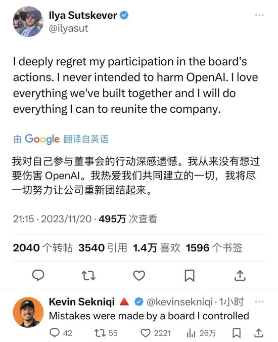 此时,伊利亚·苏茨克维似乎意识到了问题的严重性,他发文称自己对参与了董事会的决定感到遗憾,并表示将尽一切努力让公司重新团结起来。奥特曼转发了这条推文并配上了三个爱心,不知是真的不计前嫌还是在阴阳怪气。网友们也对奥特曼的行为进行了揣测性总结:一个爱心代表能跟我去微软,三个爱心表示不能。就像中文社交网络里的“对”和“啊对对对”。