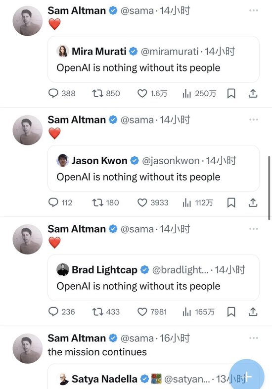 在官宣加入微软后,OpenAI的员工们纷纷坐不住了。在20日凌晨,包括米拉·慕拉提(Mira Murati)、COO布拉德 · 莱特卡普(Brad Lightcap)、CSO(首席战略官)杰森·权(Jason Kwon)在内的多位员工开始发声,他们在自己的X上发布了同样的推文:“没有员工,OpenAI一无是处”。奥特曼转发了每个人的推文并附上了爱心。这是一种凝聚力的宣示,更是对于OpenAI董事会的“威胁”。