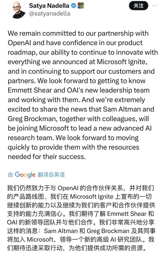 19日的午夜,微软CEO萨蒂亚·纳德拉(Satya Nadella)的一条推文再次震惊了所有关注者:山姆·奥特曼和格雷格·布罗克曼将加入微软,并领导一个新的高级AI研究团队。