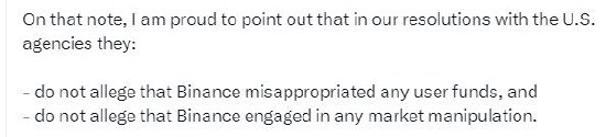 尽管币安承认违反了美国《银行保密法》和制裁规定,但赵长鹏说,他要“自豪地指出”,美国监管机构没有指控币安挪用客户资金或操纵市场。