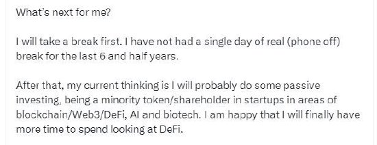 在那之后,我目前的想法是,我可能会做一些被动投资,成为区块链/Web3/DeFi、人工智能和生物技术领域初创公司的少数代币/股东。我很高兴我终于有更多的时间来研究DeFi了。”