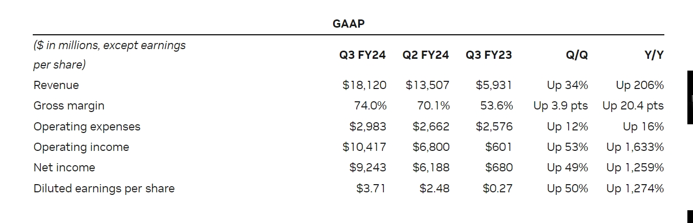美东时间周二,英伟达公布了第三季度财报,展现出人工智能热潮给公司带来的强劲增长动力。财报显示,在截至10月29日的第三财季:英伟达收入为181.2亿美元,比去年同期增长206%,比上一财季增长34%,创纪录新高。