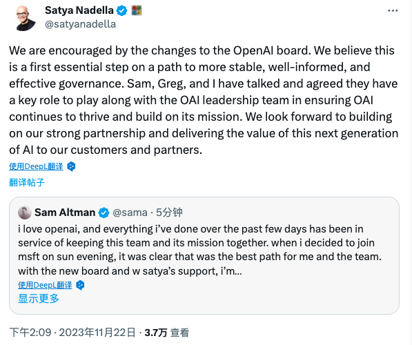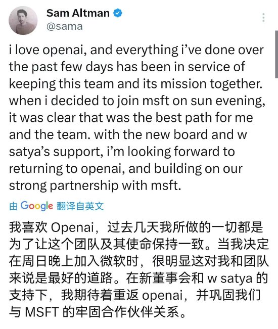OpenAI创始人山姆·奥特曼在重返该公司CEO职位后发文称,“我喜欢OpenAI,过去几天我所做的一切都是为了让这个团队及其使命保持一致。当我决定在周日晚上加入微软时,很明显这对我和团队来说是最好的选择。而在新董事会和萨蒂亚(微软CEO)的支持下,我期待着重返OpenAI,并巩固我们与微软的牢固合作伙伴关系。”