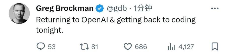而OpenAI联合创始人兼前总裁Greg Brockman回应声明称:今天取得了惊人的进展,我们将比以往任何时候都更强大和团结。重返OpenAI并将于今晚开始敲代码。