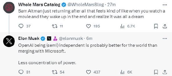 马斯克回应称:“OpenAI(半)独立可能比与微软合并对世界更好。权力不那么集中。”此前微软曾打算让奥特曼加入领导一个新的研究实验室,并接收从OpenAI辞职的大批员工。