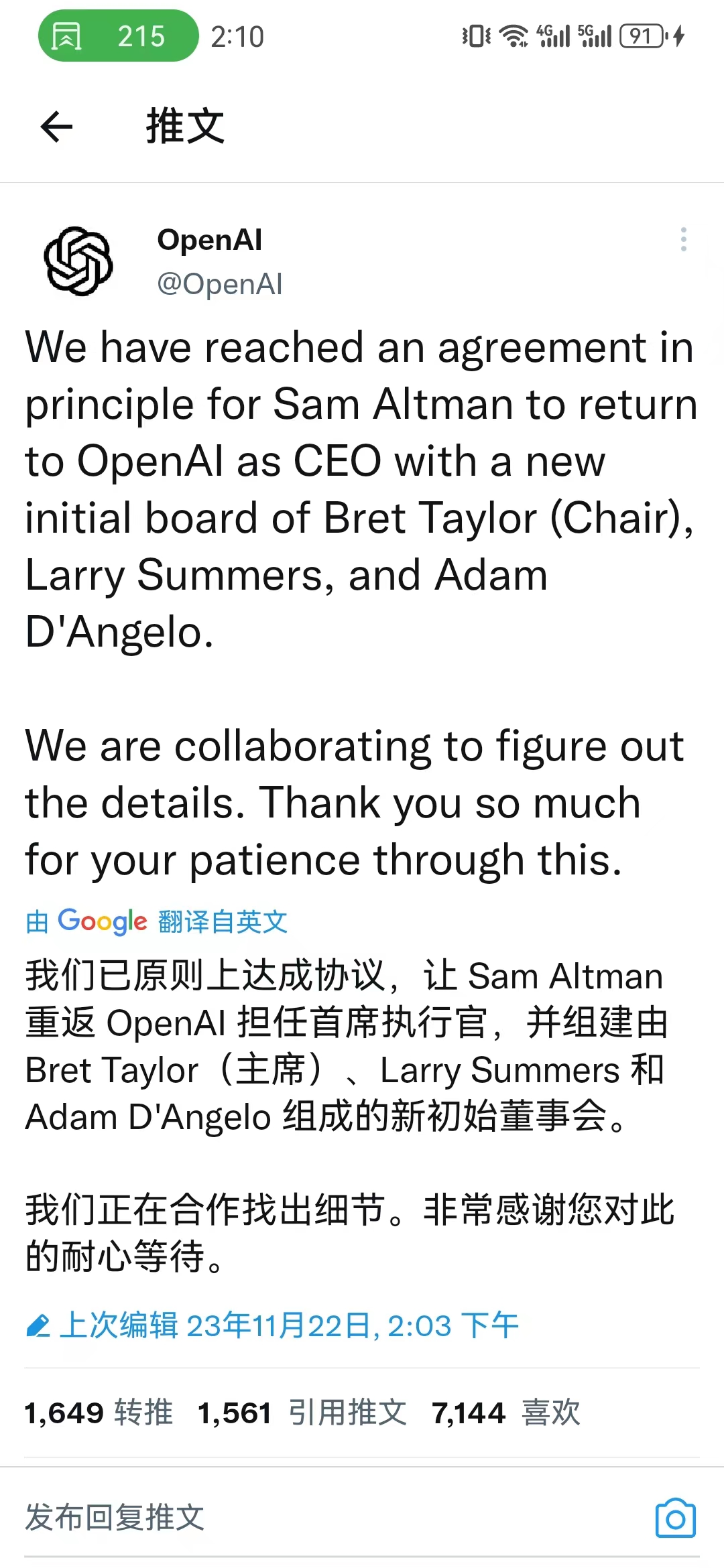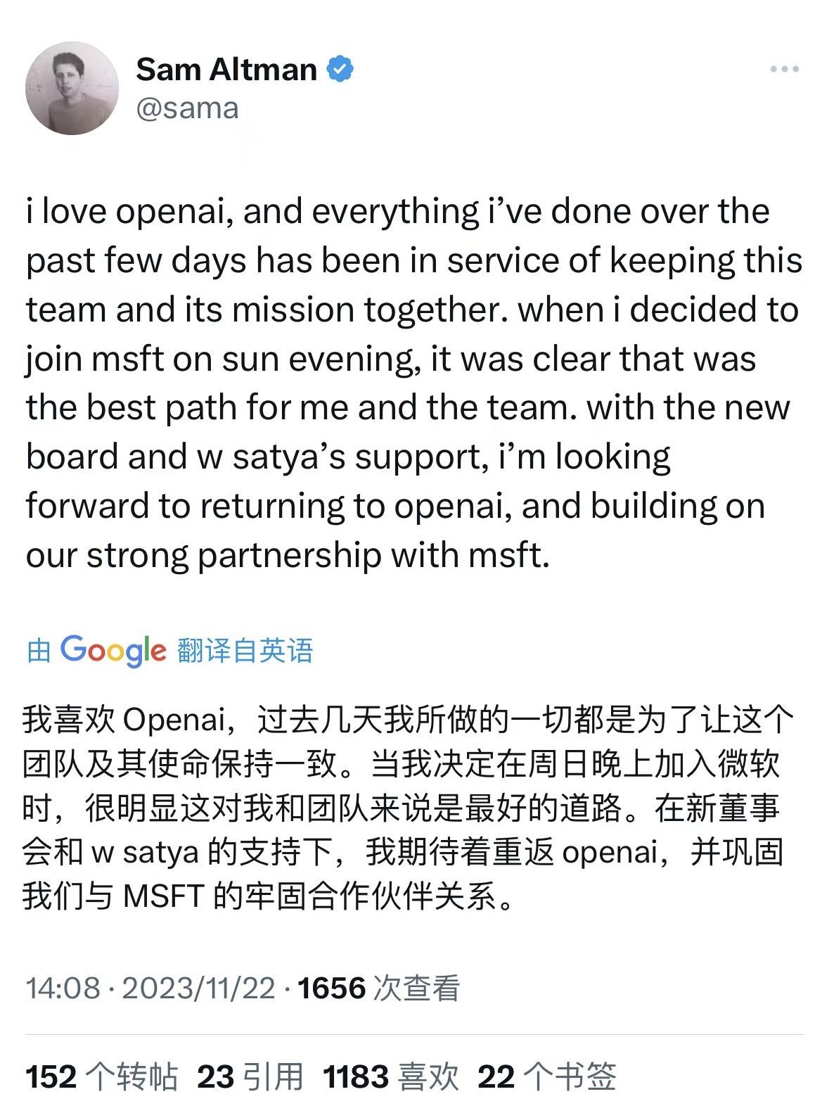 OpenAI表示,已就山姆·奥特曼恢复CEO职务原则上达成一致,山姆·奥特曼将回到OpenAI担任CEO。同一天,奥特曼表示,期待着重返OpenAI,并巩固与微软的牢固合作伙伴关系。