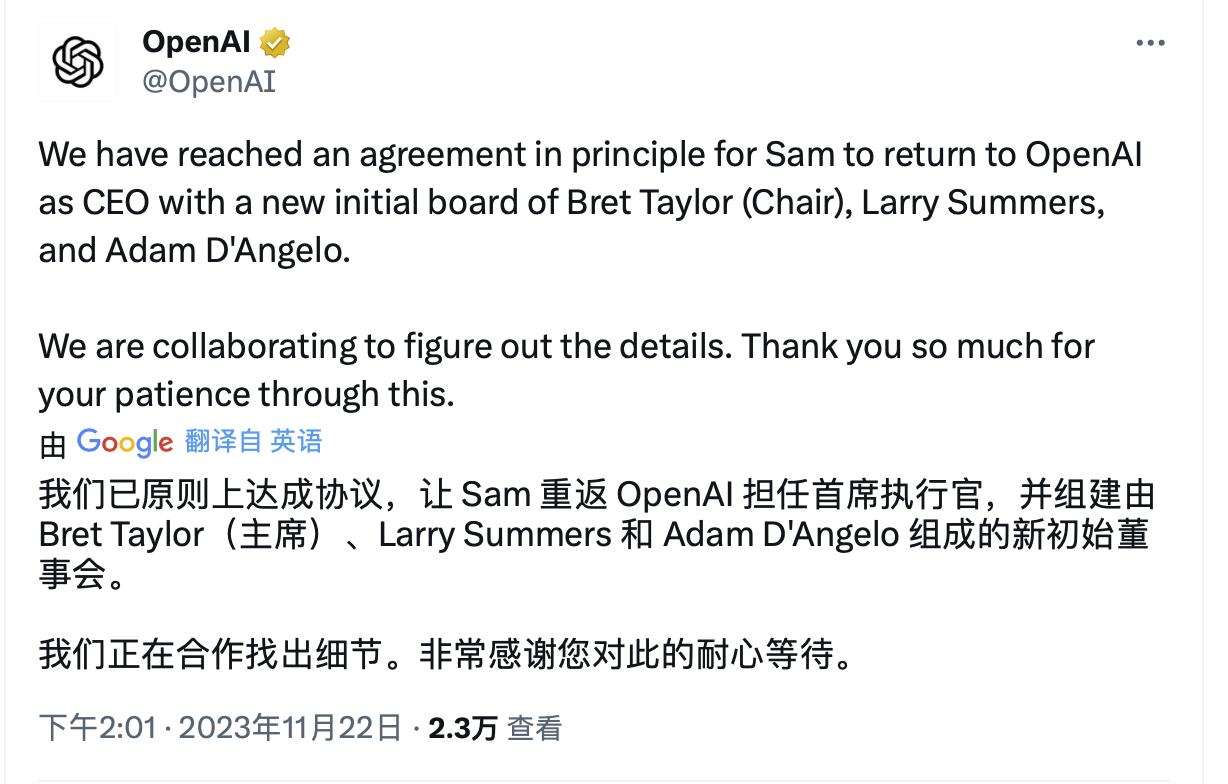 OpenAI在社交媒体上宣布,已经原则上达成协议,奥特曼重返公司担任CEO,“并组建由布雷特·泰勒(主席)、拉里·萨默斯和亚当·德安杰洛组成的新董事会。我们正在合作找出细节。非常感谢你对此的耐心等待。”