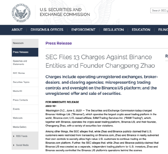 今年6月SEC向币安和赵长鹏提起13项指控,指控他们欺骗执法部门,滥用客户资金,将数十亿美元的客户资金转移到赵长鹏自己控制的单独公司。