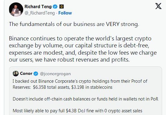 接替赵长鹏出任币安首席执行官的Richard Teng对格罗根的分析回应称:“我们的业务基础非常强大。”