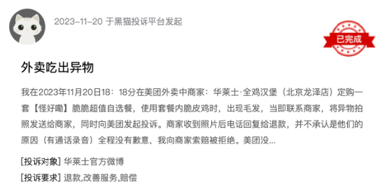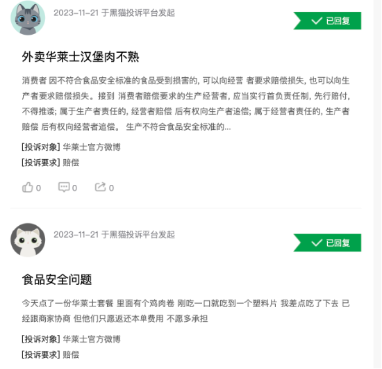 在黑猫投诉上,也有不少人吐槽华莱士的卫生问题,例如在脆皮鸡中发现毛发、汉堡肉不熟、鸡肉卷中有塑料片等等。