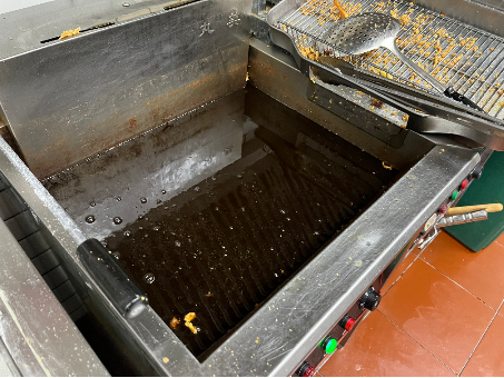 油锅炸制就是后厨的重要加工程序之一。新浪科技发现,华莱士的炸油颜色已如同酱油。店员表示,该油系昨晚刚刚换新,但到了第二天,也就是油已使用第三天时,油锅颜色更深了。