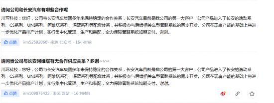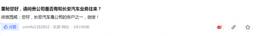 11月27日盘后,据不完全统计,包括金禄电子、溯联股份、金固股份、双林股份、川环科技、广汇汽车、亚太股份、德赛西威、三联锻造和光庭信息在内的累计10家上市公司近两个交易日互动平台回复与长安汽车供货或合作具体情况。