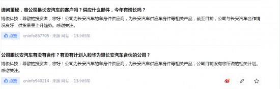 博俊科技11月27日在互动平台表示,公司为长安汽车的车身件供应商,为长安汽车供应车身件等相关产品,截至目前,公司与长安汽车合作情况良好,供货量呈上升趋势。