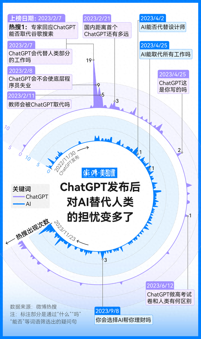 我们用AI、ChatGPT为关键词,梳理了自ChatGPT发布后近一年的微博热搜榜数据后发现,ChatGPT发布后,人们对AI的态度逐渐从好奇转变为了担忧:如果用AI就可以写策划、写代码、写小说,那我还能靠什么为生?