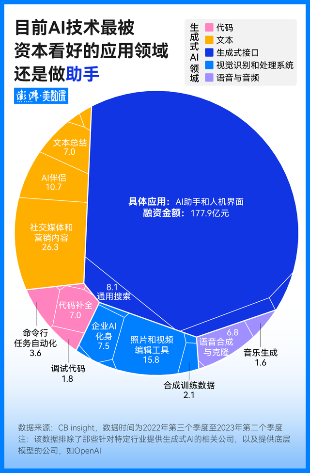 这样迅猛的发展速度和广阔的前景让不少人嗅到商机。根据风险投资数据公司CB insight的统计,从全球210多家给跨行业领域提供生成式AI服务的公司来看,生成式AI涉及领域广泛,62.3%的融资额都集中在AI助手和人机界面等应用。