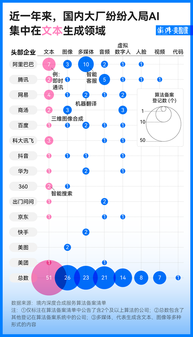 在这151个算法中,33.8%的生成合成式算法都集中在文本生成领域。互联网大厂登记的生成合成式算法基本上都是在融入各家的业务中,比如阿里巴巴的7个文本生成算法,分布在大麦网的智能客服、钉钉的即时通讯、夸克的图像识别等场景。此外,腾讯在音频领域登记了不少算法——除了酷狗旗下的获取用户录音制作歌曲,还有像是文本转有声读物等方式。