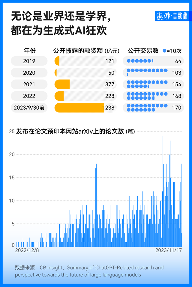 而普通人对AI产生的新时代问题,或许是雾里看花,但面对这样一个能写小说、代码,还会画画、唱歌的工具,也会有自己的疑问——AI会替代我吗?AI意识觉醒了吗?AI伴侣靠谱吗?澎湃美数课尝试用多个角度的数据来解答这一年里,以ChatGPT为代表的AI给普通人和世界到底带来了哪些变化。