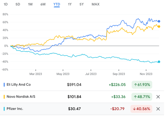 与辉瑞的市场走势截然相反,今年手握“减肥、老年痴呆”两大神药的礼来股价节节攀升,今年迄今涨幅达到了近62%;减肥药龙头诺和诺德的股价迄今涨幅达到了近49%。