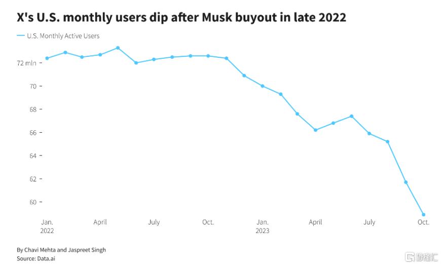 不过,数据显示,自马斯克去年收购X以来,该平台在美国的月活跃用户也下降了约19%。