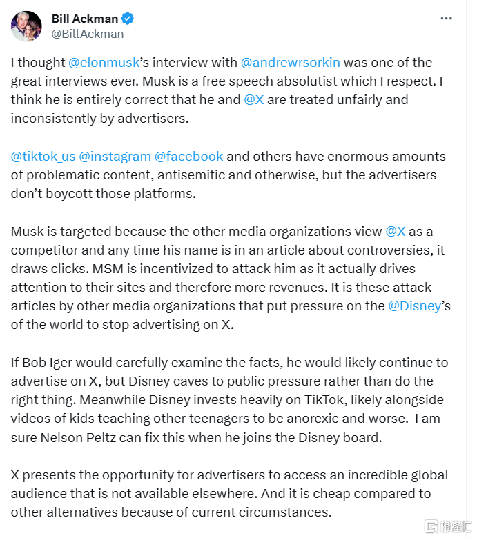 与此同时,知名投资人阿克曼也公开发文支持马斯克和X,他表示,其他平台也存在反犹太注意等有问题内容,但广告商只抵制X,这是不公正的。