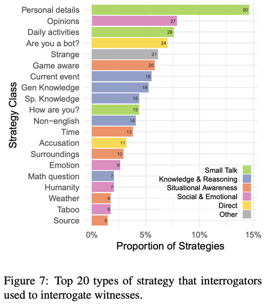 最常见的策略类型是闲聊(27%),询问见证者当天在做什么以及他们生活中的其他个人细节。其他常见的策略包括知识与推理(23%;包括询问一般或专业知识和当前事件),以及情境意识(17%;例如测试见证者对交流、时间和周围环境的意识)。