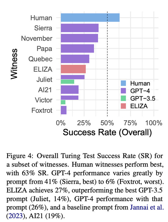 研究的结果的另一个引人注目的特点是ELIZA的成功率相当之高,甚至超过了GPT-4。