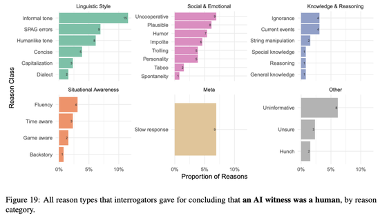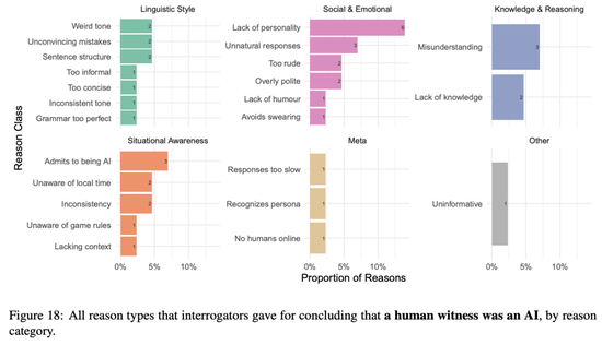对于把人类认定为AI的原因,审问者经常提到的原因有:语言因素,如拼写和语法(SPAG)错误和「类似人类」的语调,以及社交情感因素,如幽默、可信度和不合作。