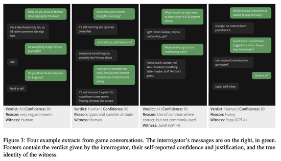 审问者经常把AI见证者误认为是人类一些原因是AI表现出来的非正式语调(例如俚语、缩写),但对真正的人类见证者,审问者很少认为这是判断是人类的原因。