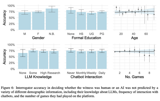 研究人员还测试了,已知影响人机交互的人口统计学因素,包括年龄、性别和受教育程度是否能预测调查员的辨别能力。