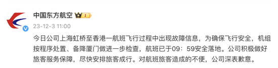 今天11时,中国东方航空官方微博发布消息称,今日公司上海虹桥至香港一航班飞行过程中出现故障信息,为确保飞行安全,机组按程序处置、备降厦门做进一步检查,航班已于9:59安全落地。