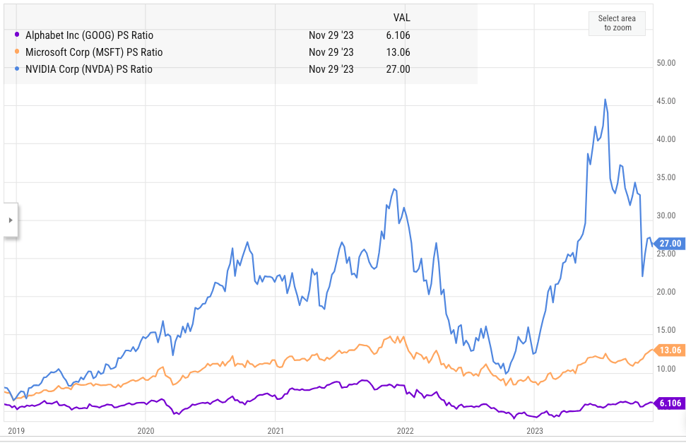 英伟达股票在 2023 年上半年出现了前所未有的牛市。这使得市盈率大幅上升。目前,该公司的市盈率为 27 倍,而微软为 13 倍,Alphabet 为 6 倍。英伟达的业务也具有很强的周期性,过去几年我们的股价已经出现了大幅波动。与微软和谷歌等收益更稳定的股票相比,这又增加了该股的风险溢价。