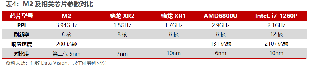 据悉,光学方面,Vision Pro采用超短焦光学模组3P Pancake方案,能够实现当前Pancake中最大的120°视场角,极具清晰度和通透度,有效提升用户的沉浸感。显示方面,其搭载高分辨率的Micro OLED 屏幕,合计达2300万像素,单眼达到4K效果。此外,Vision Pro采用M2+R1双芯片设计,M2芯片在制程、数据缓存以及GPU执行能力和渲染能力方面均优于目前的主流产品高通骁龙XR2和XR2+Gen1,全新R1芯片专为应对实时传感处理任务,传输数据12毫秒就可以触达显示器,头显的响应速度、实时交互、沉浸感等将得到极大提升。