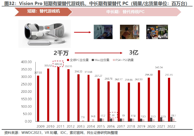 苹果CEO库克表示,“如同Mac将我们带入个人计算时代,iPhone将我们带入移动计算时代,Apple Vision Pro将带我们进入空间计算时代”。传统VR设备如Quest系列更多将应用集中于游戏、影音等娱乐场景,苹果Vision Pro从游戏机的“枷锁”里面突破,借助苹果自身生态系统优势,使其与iphone、pad、Mac等其他设备保持同步,应用场景泛化至社交、办公、生活等领域。方竞等人认为Vision Pro短期有望替代传统游戏机,中长期有望替代传统PC。