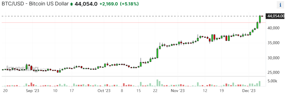 截至发稿,比特币已经突破4.4万美元,达到了近两年来的最高水平。今年迄今,比特币已累计上涨166%。