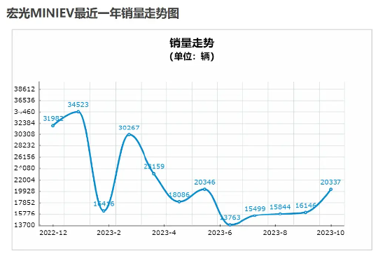 然而,自月销量达到超5万台的高峰后,五菱宏光MINIEV开始出现销量下行态势。尤其是今年以来,已经数月销量在2万台以下。乘联会数据显示,2023年10月,五菱宏光MINIEV的销量为20337辆,同比下降57.51%;根据五菱近日公布的11月新能源销量数据,五菱宏光MINIEV销量为23518辆,虽然实现环比增长,但依然未能摆脱同比下滑的态势。