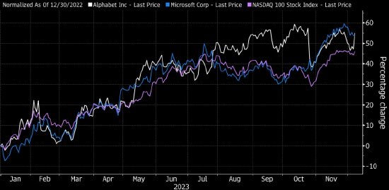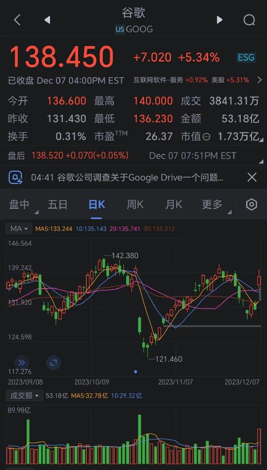 Alphabet Inc.股价周四大涨,该公司发布的Gemini AI模型,缓解了投资者对其在人工智能市场地位的担忧。Alphabet股价上涨5.3%,创下7月份以来最大单日涨幅,市值增加逾870亿美元。该股2023年已上涨55%,相比之下纳斯达克100指数上涨46%,微软上涨55%。微软对OpenAI的投资,被视为是Alphabet在人工智能领域的主要竞争对手。