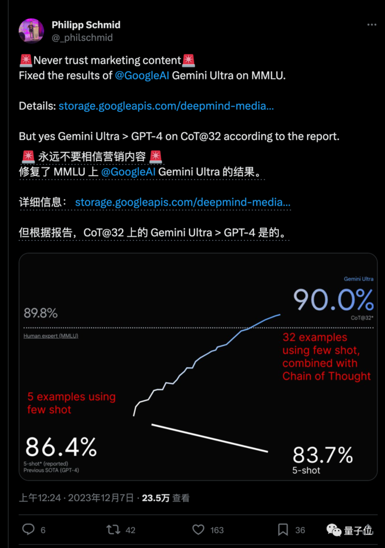 MMLU测试中,Gemini结果下面灰色小字标称CoT@32,展开来代表使用了思维链提示技巧、尝试了32次选最好结果。