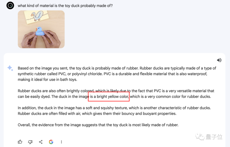 视频的结尾,博主还拿出了橡胶鸭子玩具,我们也拿这一帧(图8)让Gemini分析一下鸭子的材质。