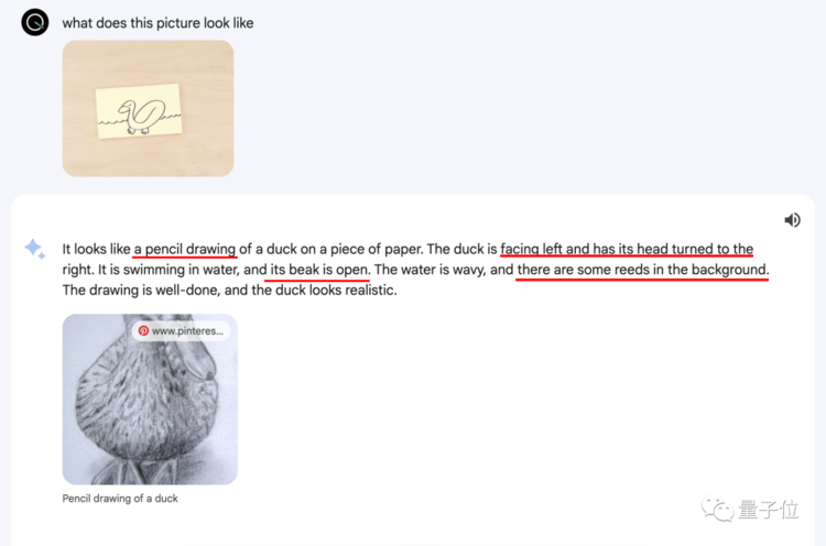 Gemini还有一大卖点是多模态能力,针对开头画小鸭子的视频,我们从中抽取了8个关键帧,分别进行提问,看看Gemini的表现有没有那么神奇。